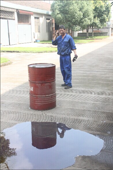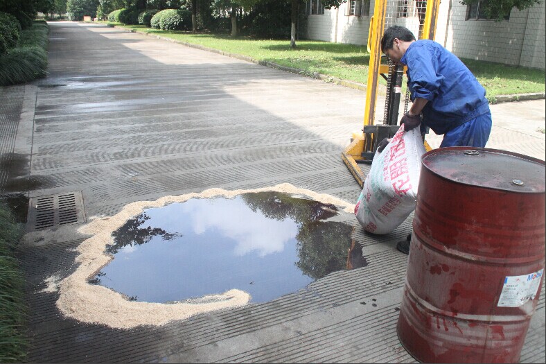 3. 應急救援人員立即拿來應急物資,對泄露廢油進行處理,用木屑設置屏障攔截,防止污染面擴大或進入下水道,并在圍堰內(nèi)均勻灑上木屑吸附。