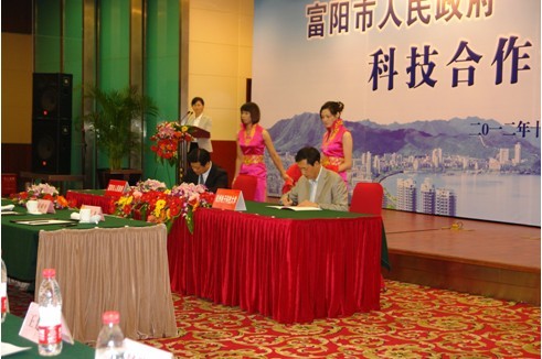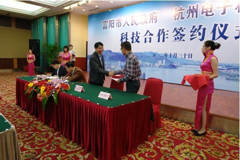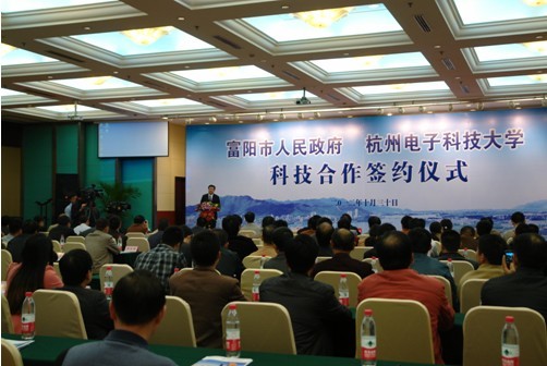 (富陽(yáng)市委副書記、市長(zhǎng)章舜年與杭州電子科技大學(xué)校長(zhǎng)薛安克簽約儀式現(xiàn)場(chǎng))