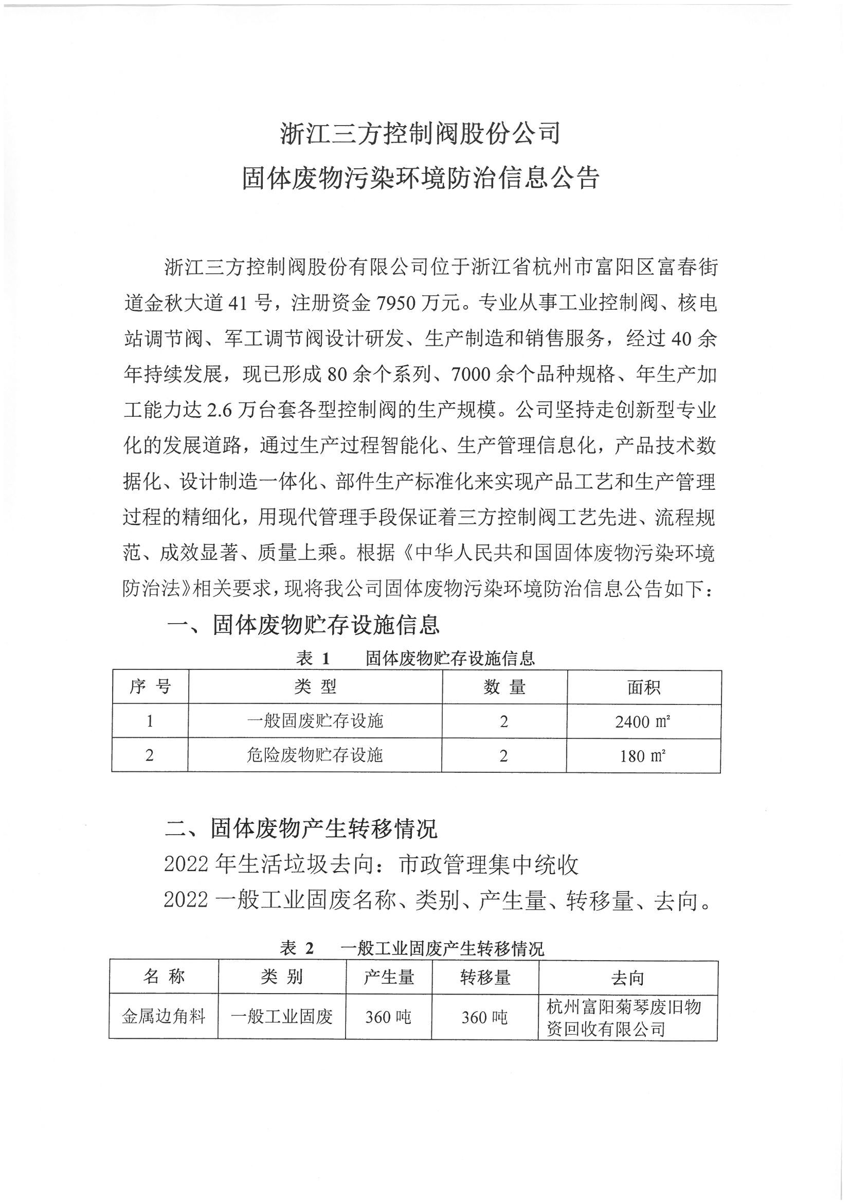 浙江三方控制閥股份公司 固體廢物污染環(huán)境防治信息公告