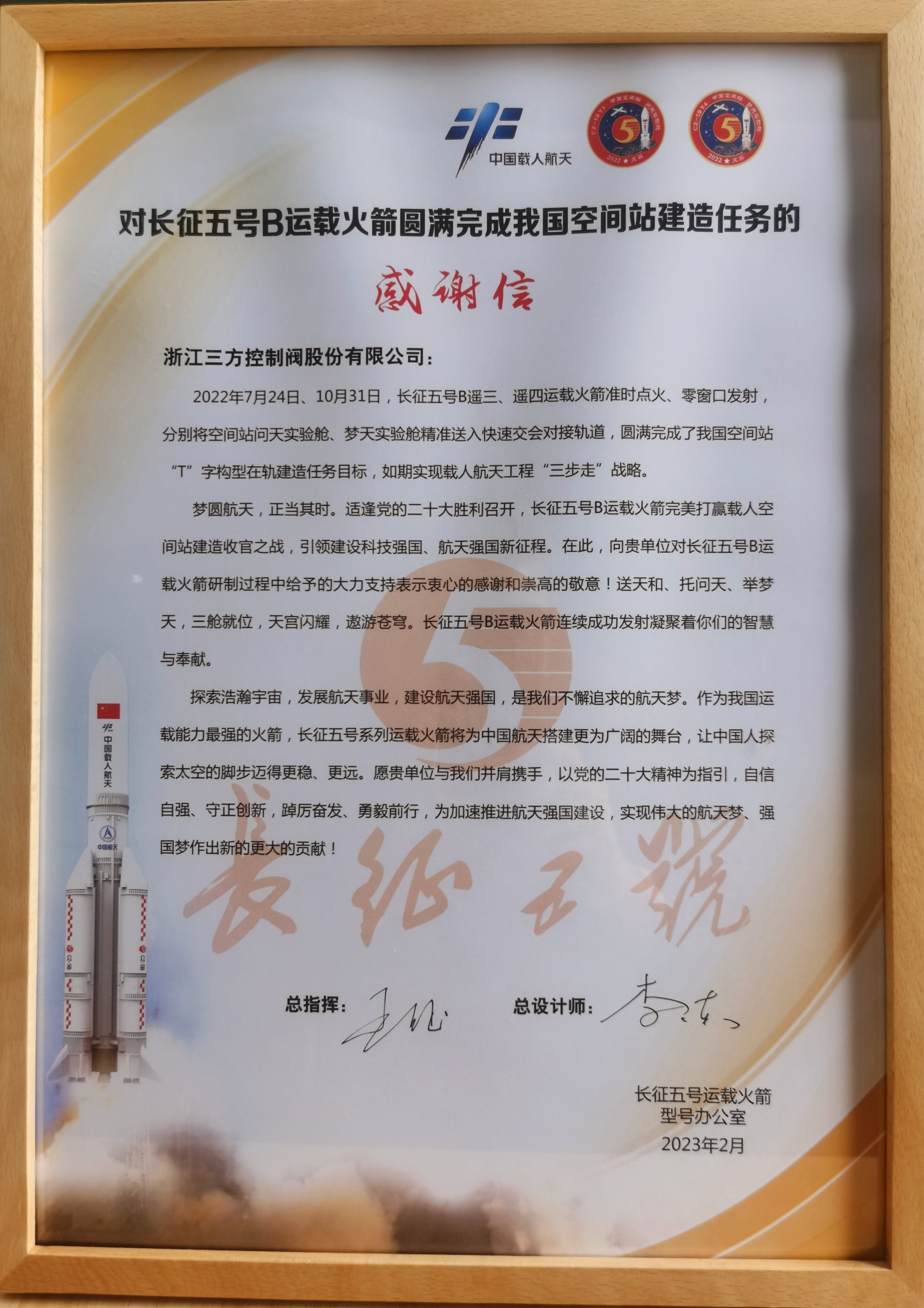 對(duì)長(zhǎng)征五號(hào)B運(yùn)載火箭圓滿完成我國(guó)空間站建造任務(wù)的感謝信